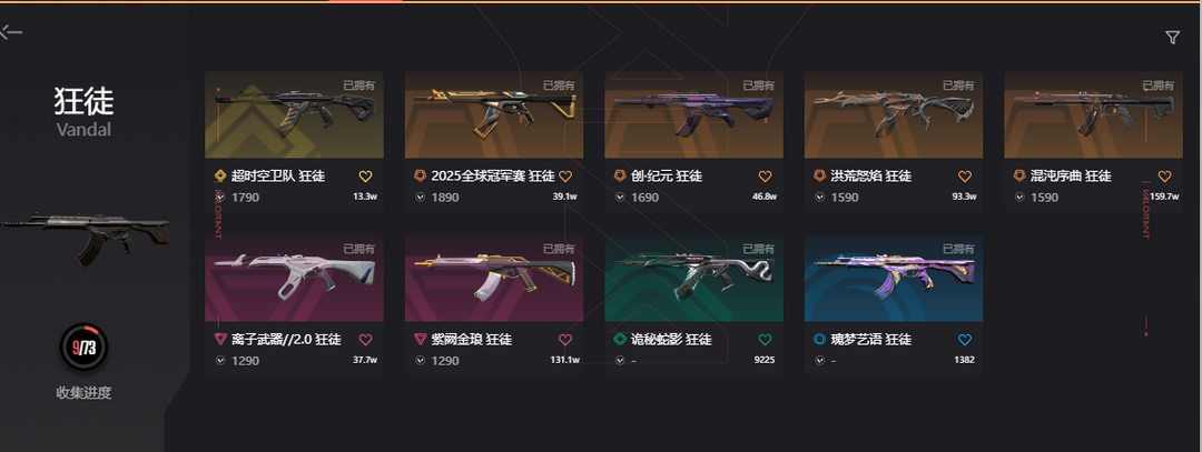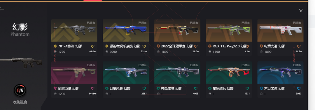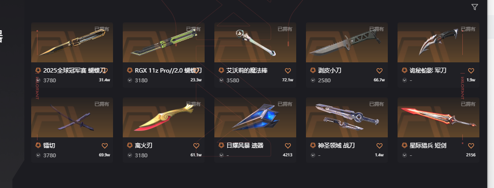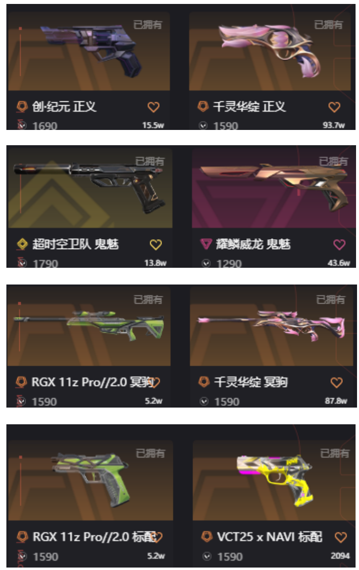 标配:显卡、NAVI; 鬼魅:耀麟威龙、超时空;奥丁:西部未来 冥狙:显卡;千灵华绽; 幻影:781、电玩、22冠军、显卡、电音、侦察 狂徒:25冠军、创纪元、流脓、混沌、离子、超时空、紫金 刀皮:25冠军蝴蝶刀、显卡蝴蝶刀、艾沃莉的魔法棒、剥皮小刀、镭切、离火刃