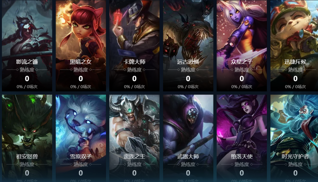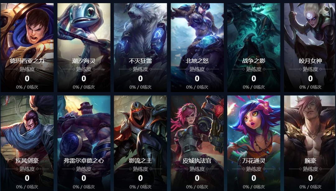 赏金猎人;皮城女警;探险家;寒冰射手;黑暗之女;德邦总管;远古恐惧;无极剑圣;牛头酋长;亡灵战神;战争女神;众星之子;迅捷斥候;麦林炮手;祖安怒兽;雪原双子;蛮族之王;武器大师;堕落天使;时光守护者;痛苦之拥;虚空恐惧;殇之木乃伊;披甲龙龟;冰晶凤凰;祖安狂人;琴瑟仙女;风暴之怒;瓦洛兰之盾;邪恶小法师;诺克萨斯统领;蒸汽机器人;熔岩巨兽;德玛西亚皇子;复仇焰魂;盲僧;暗夜猎手;沙漠死神;狂野女猎手;兽灵行者;圣锤之毅;不屈之枪;铁铠冥魂;德玛西亚之力;曙光女神;刀锋之影;放逐之刃;光辉女郎;远古巫灵;九尾妖狐;潮汐海灵;不灭狂雷;北地之怒;诺克萨斯之手;皎月女神;虚空之女;星籁歌姬;疾风剑豪;虚空之眼;戏命师;祖安花火;暴走萝莉;涤魂圣枪;圣枪游侠;影流之主;时间刺客;皮城执法官;魔法猫咪;沙漠玫瑰;魂锁典狱长;解脱者;封魔剑魂;腕豪 皮肤:苔原猎手 菲兹;战神阿瑞斯 盖伦;死亡领主 莫德凯撒;防弹武僧 李青;法国皇室 厄运小姐 小小英雄:小河灵 棋盘皮肤:默认棋盘 进攻特效:默认 进攻特效
