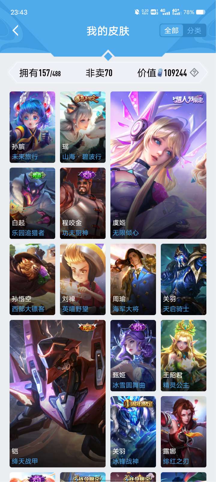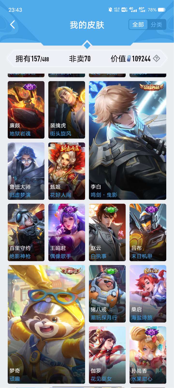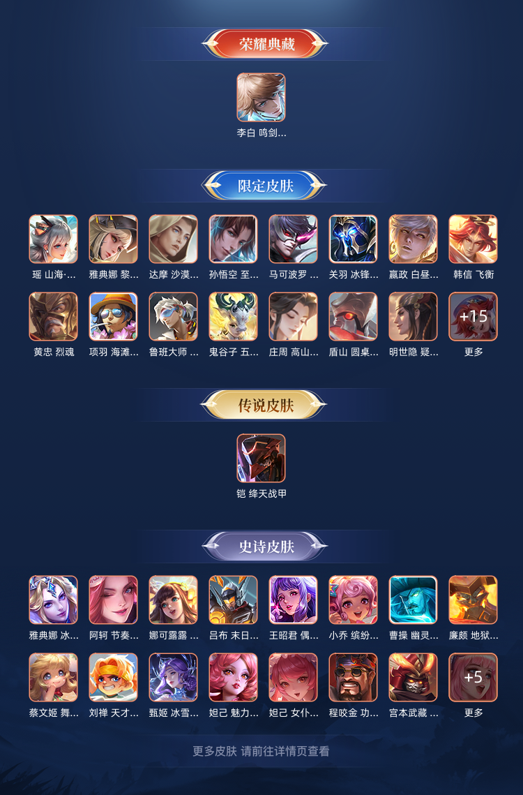 本游戏账号: ,英雄多,皮肤多。典藏皮肤1个,感受典藏皮肤带来的优质体验快感,FMVP皮肤1个,尽情享受FMVP皮肤带来的主角光环, 私人所属英雄皮肤有:李白 鸣剑·曳影铠 绛天战甲貂蝉 猫影幻舞达摩 沙漠行僧||关羽 冰锋战神||韩信 飞衡||黄忠 烈魂||马可波罗 暗影游猎||孙悟空 至尊宝||嬴政 白昼王子||瑶 山海·碧波行,等等
