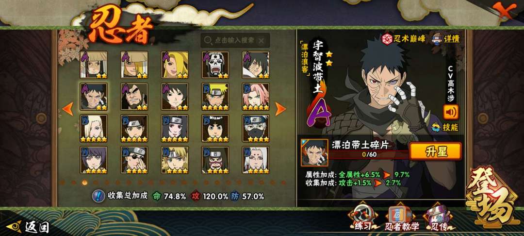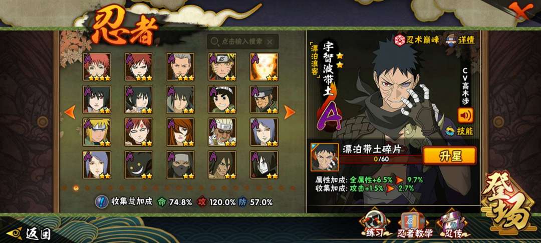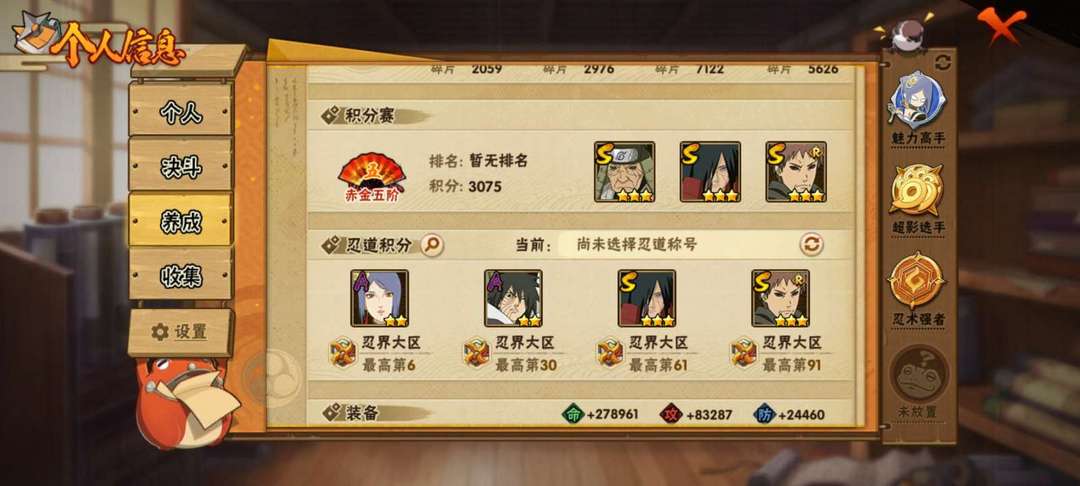 战力只有700多万,不建议用来打团本,体验忍者还是很不错的,曾打到过全服第六新南,可以截屏装b发给朋友看,有4个金标,约单挑时也可以发这个截图来吓唬对手