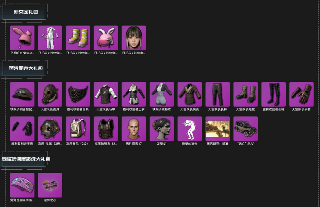 【外观】发型65,朱莉·斯科尔斯,午餐肉,马戏团之星妆容,邓肯·斯莱德,发型64,美人鱼发型,女性面容7,狂人·马尔霍特拉,乔纳森·卡茂,发型38,维纳斯面部妆容,发型16,恶魔骑手妆容,发型27,发型44,发型51,发型72,PUBG x NewJeans HANNI,发型43,小丑发型,哈莉·奎茵发型,发型29,发型31,猪八戒的发型,萨迪娅·库雷希,匕首纹饰加红晕妆容,美人鱼妆容,塞壬的发型,小丑妆,拉万,萨迪娅的头纱,哈莉·奎茵妆