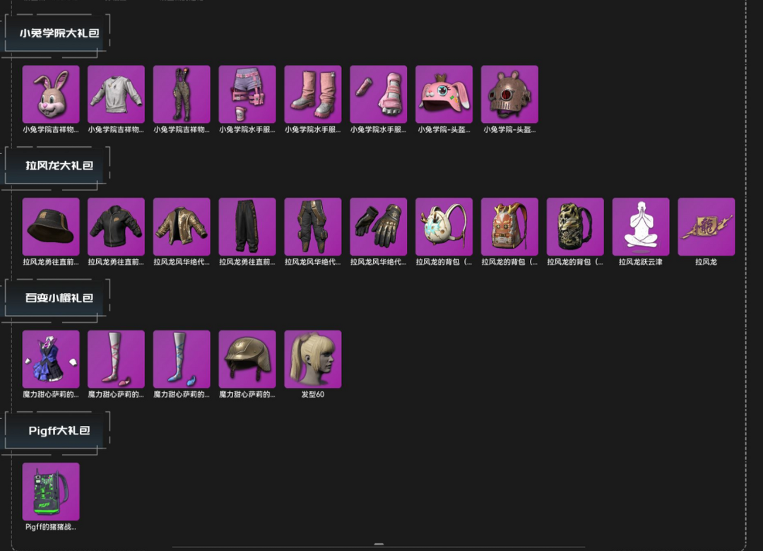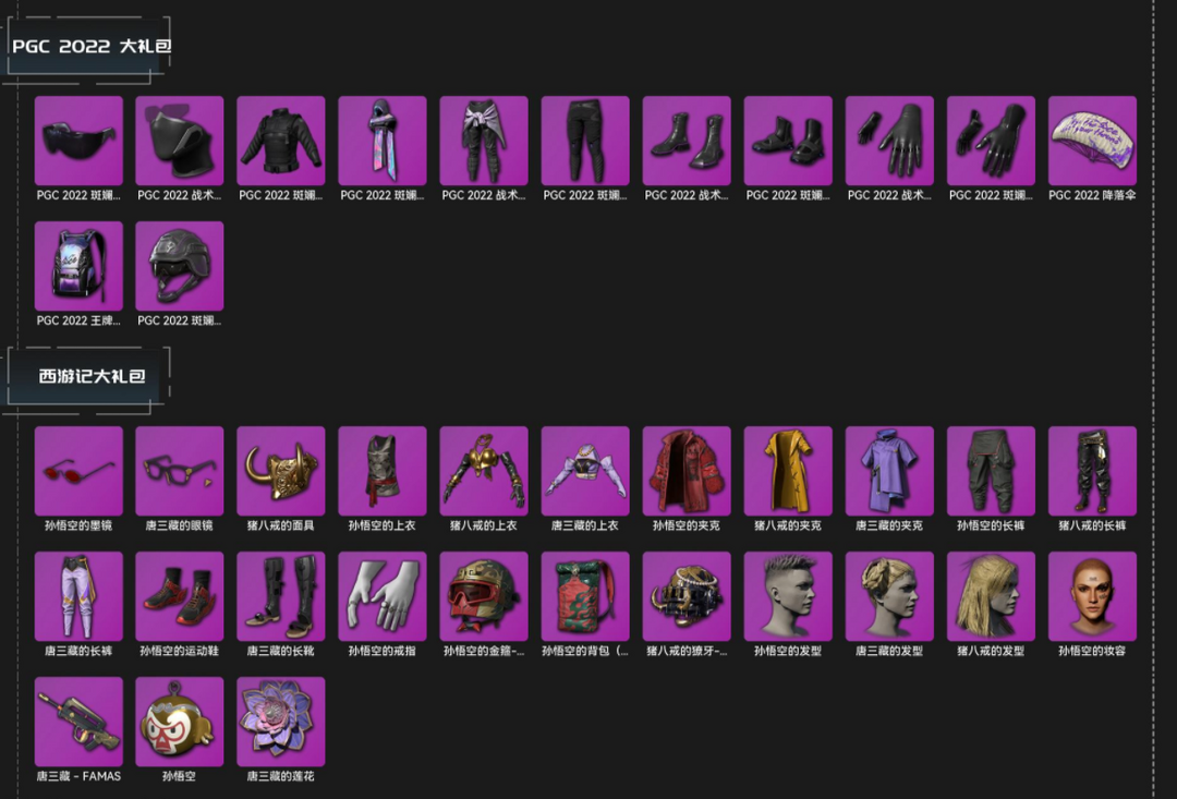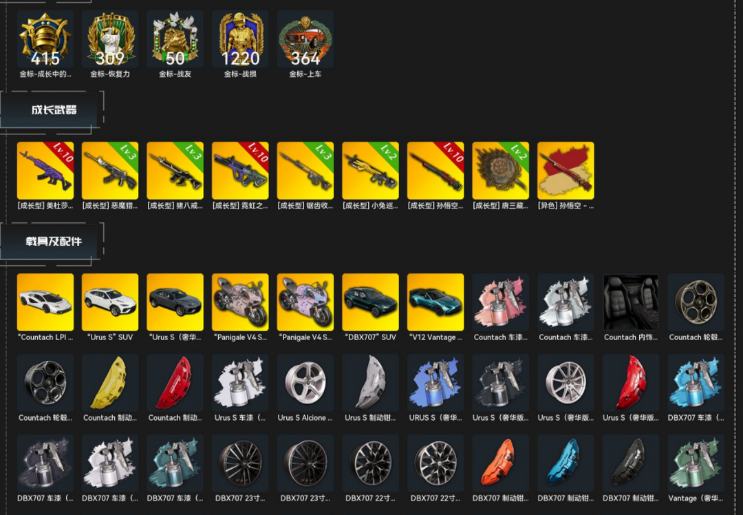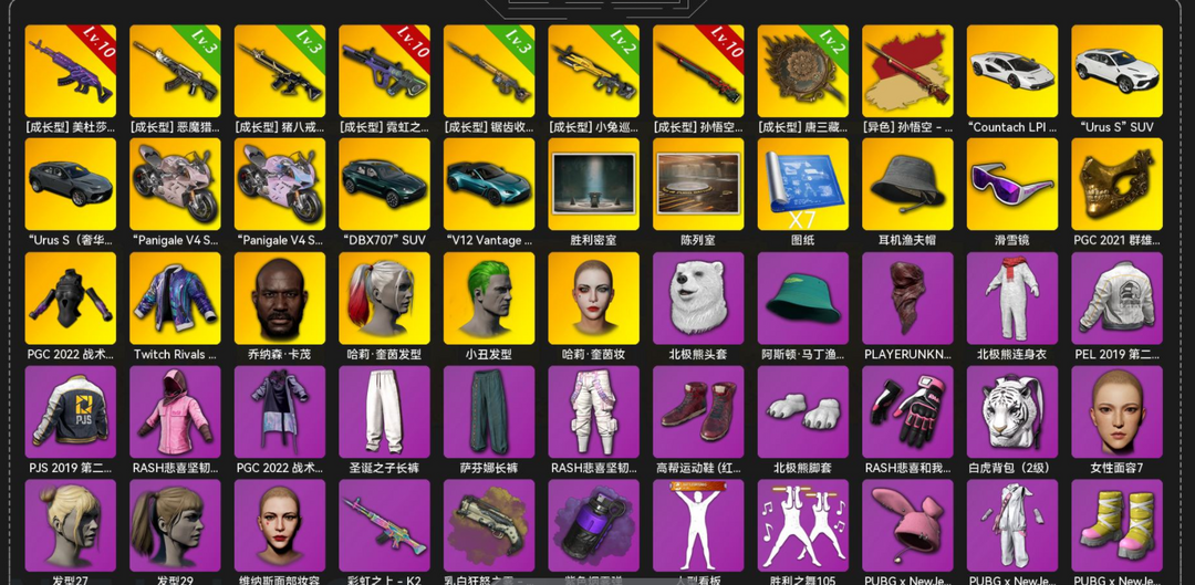 【成长武器】[成长型] 唐三藏 - 平底锅[2级],[成长型] 恶魔猎手 - ACE32[3级],[成长型] 孙悟空 - M24[10级],[成长型] 美杜莎 - Beryl M762[10级],[成长型] 猪八戒 - M416[3级],[成长型] 小兔巡逻队 - Mk12[2级],[成长型] 霓虹之梦 - AUG[10级],[成长型] 锯齿收割者 - SLR[3级]