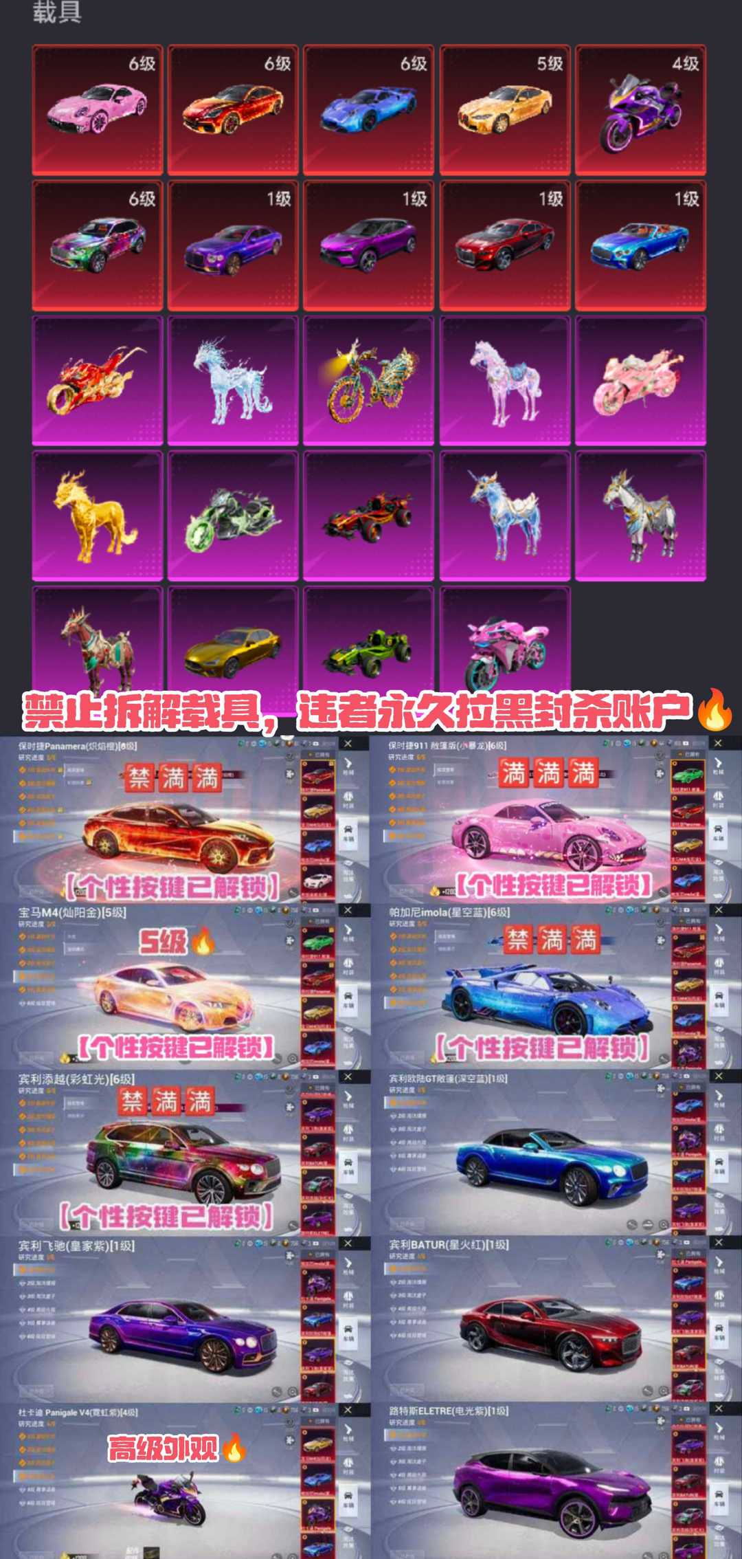 ❤️拆解枪械载具永久拉黑,如果装备与图片描述不符请撤单,不要去拆解。 ⭐账号价值高,累计充值几十万,如开挂或使用第三方造成封号,按累计充值金额起诉赔偿,打官司追究到底。 ⭐⭐注意事项: 1、拆解枪械拉黑处理并上报封停平台账号!!! 2、禁止伤害队友、频繁逃跑游戏,违者永久拉黑。 3、如造成禁麦禁言,拉黑处理,请文明游戏。 4、订单由平台客服处理,号主无权处理,有问题咨询平台客服。 ❤️温馨提示: 感谢各位老板的支持!!!协助登录后不跳转到游戏,可能是延迟,请手动去游戏登录界面查看有无登录。如果没登录,请关闭和平精英重新打开更新后再重新协助登录。