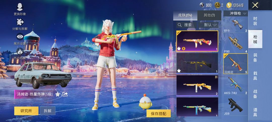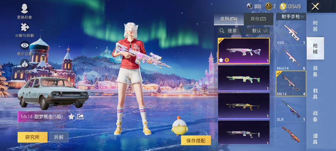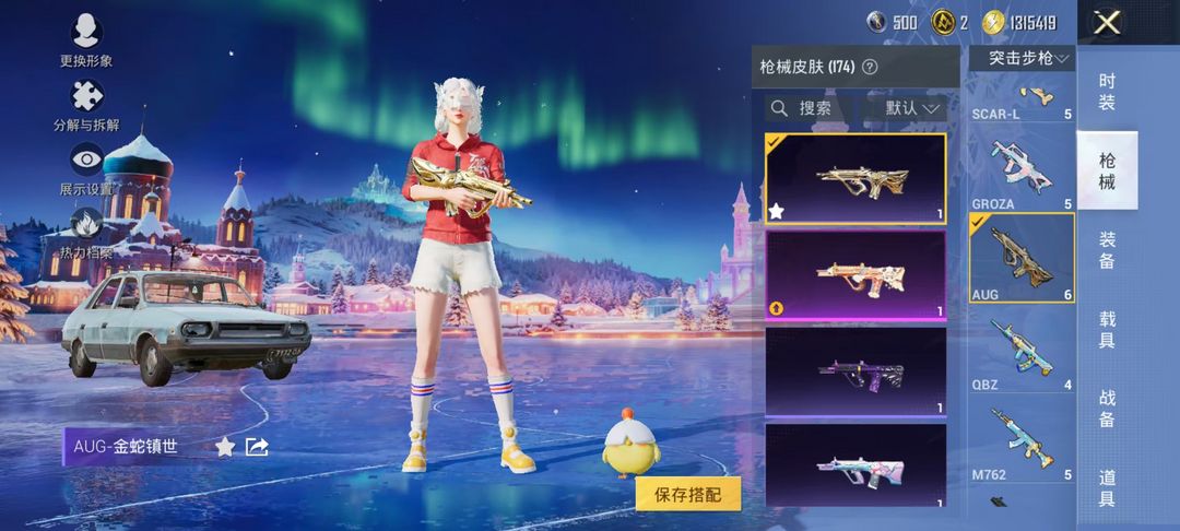 突击步枪(AKM-生命誓言,AKM-破晓战魂,AKM-虎虎生威,AKM-荧星灵猫,AKM-龙的传人,AKM-涂鸦街区,AKM-霓彩脉冲,AKM-夜灯,GROZA-乌木金纹,GROZA-海盐豹豹,GROZA-晶梦幻蝶,GROZA-无面战甲,GROZA-治愈之星,SCAR-L-红色方程式,SCAR-L-小狗蛇点点,SCAR-L-彩虹符号,SCAR-L-炫彩节奏,SCAR-L-星途旅人,Famas-乌木金纹,Famas-霓彩脉冲,Famas-镜域双华,M762-牛气冲天,M762-雏菊兔兔,M762-云朵鹅,M762-奇异狩猎者,M762-天降萌叽,QBZ-乌木金纹,QBZ-原初圣火,QBZ-纯真浪花,QBZ-彩虹符号,AUG-紫晶流影,AUG-冰晶雪宝,AUG-暖羊咩咩,AUG-异域银装,AUG-耀粉歌者,AUG-金蛇镇世,M416-夜灯,M416-潮汐统领,M416-电玩时刻,M416-红色方程式,M416-神秘黑猫,M416-糯团青竹,G36C-暗夜玫瑰,蜜獾-鸡智如我,蜜獾-乌木金纹,蜜獾-糖糖葫芦,AC-VAL-甜心亚梦,M16A4-红色方程式,M16A4-蓝色火焰,M16A4-幻