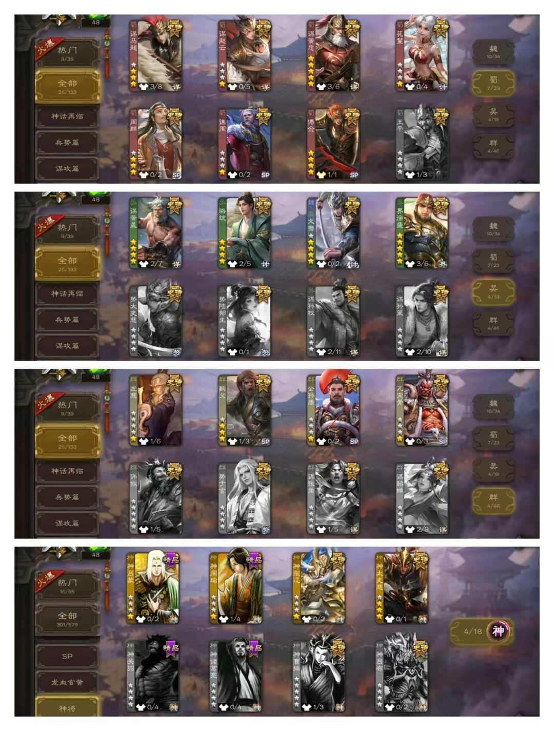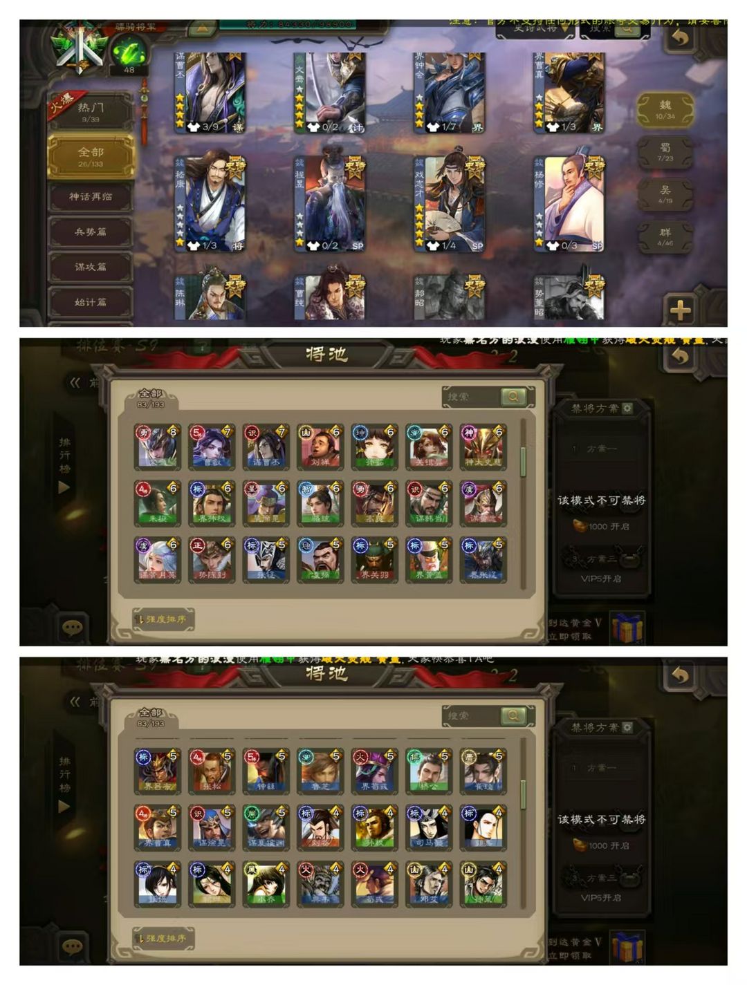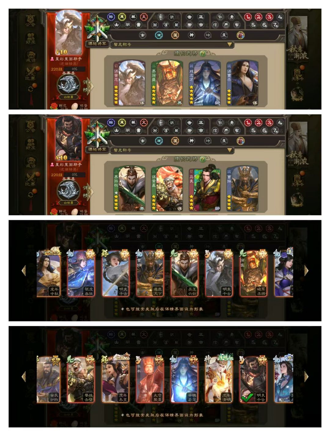官方一等骠骑,无卡,VIP10! 10四星玉龙:动谋黄忠动界徐盛动戏志才动谋黄盖动谋曹丕,文鸯神太史慈! 26史诗武将,傅佥界钟会神张辽聚义骆统花蔓等! 15动皮35金皮135国战皮肤!